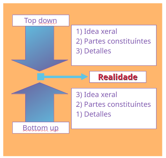 A estadística di que a maioría das persoas que están a ler este artigo, á hora de enfrontarse a un novo proxecto, collen unha idea xeral e fican valorando as xeneralidades durante un tempo antes de pasar a definir as partes e finalmente os detalles. Primeiro ven unha paisaxe de verán, logo ven a praia, o mar e a masa de turistas, para finalmente fixarse nos nenos que constrúen castelos con algas e cunchas para as portas e ventás, na muller que le un libro de Isabel Allende baixo a protección dunha pamela e no home que toma o sol cuberto en crema protectora e aderezado de area. Este proceso no que se observan as xeneralidades e logo vaise un achegando aos detalles é o procesamento top-down (de arriba a abaixo).