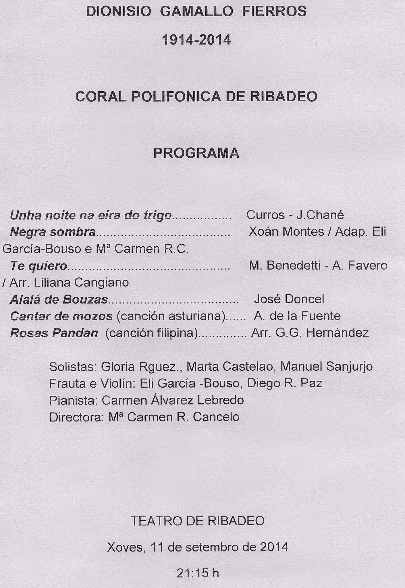 Onte tivo lugar unha nova entrega dos actos sobre Dionisio Gamallo co gallo do centenario do seu nacemento. No cine teatro J. Rubio Jiménez falou sobre Clarín nos papeis de Gamallo, precedido dunha curta posta en escea de M. Valín, os agradecementos de Toni Deaño e unha longa presentación de Roberto Rodríguez. Despois, a Coral Polifónica interpretou diversas pezas (só gravadas as primeiras)