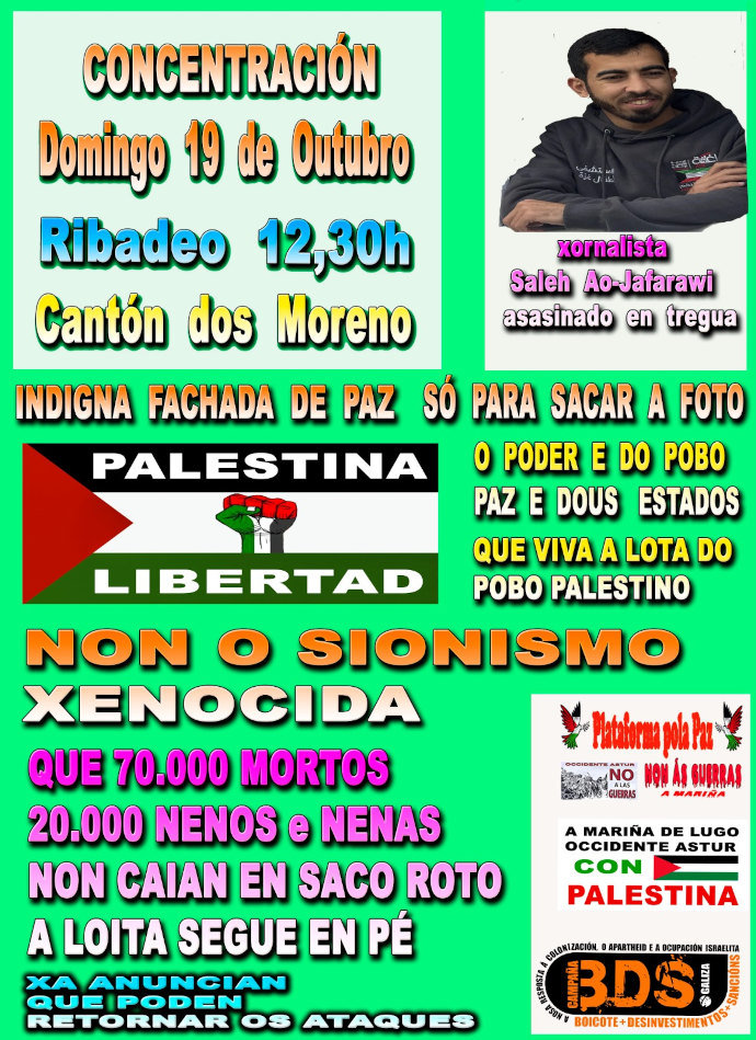 Paz si, xenocidio, non. Non á guerra, si á reconstrución. Sexamos humanos, non bestas de odio. En Palestina e no mundo, Paz.