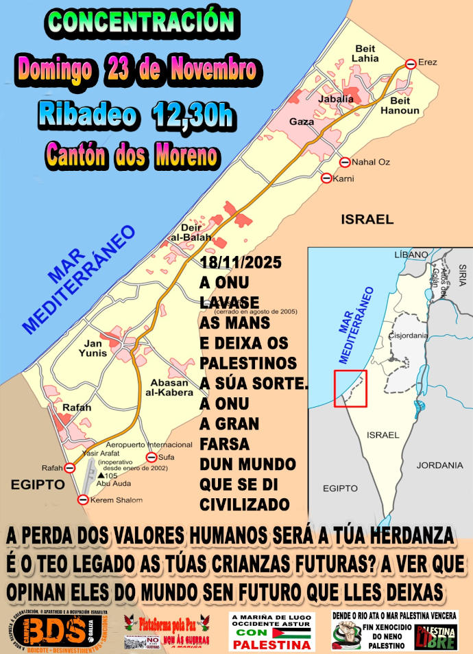 Despois de máis de 80 millóns de mortos e millóns de mutilados da 2ª Guerra Mundial, naceu a ONU como organismo internacional que fora árbitro de PAZ e que non permitira xamais tales atrocidades. Pero naceu con un cáncer, o Dereito a Veto por parte de EEUU e outras poucas nacións que foran belixerantes. Hoxe ese Veto, permite a masacre de Palestina. Ou sexa, aflorou o cáncer e vai ser dificil de estirpalo senón se utiliza a mutilación do membro, esto é, botar a EEUU da ONU