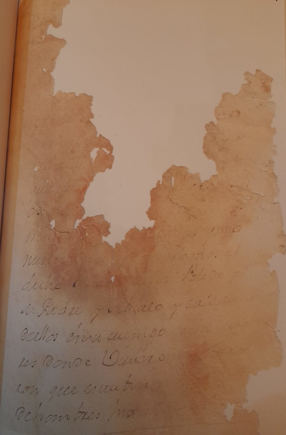 O relatado non nos daba a coñecer a que puidera referirse tal descrición. Deixei a páxina entre dous folios, para que en futuras manipulacións non fixera falta tocarlle, pois podíase voltear tocando só os folios. Un documento manuscrito do século XVIII en aquelas condicións, eu nunca o tivera entras mans e facíame tremer un pouco para non estragalo.