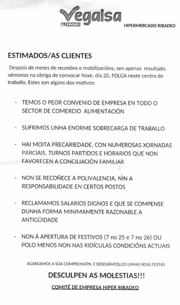 Sábado 20 de decembro, campaña do Nadal. Paso por casualidade diante dun Centro Comercial, o Eroski de Vegalsa en Ribadeo. Si, xa sei que non se soe pasar por diante dos centros comerciais de casualidade e menos no Nadal, pero así foi. Vexo dúas ou tres bandeiras e unhas 20 persoas na súa veciñanza, no aparcamento diante da entrada, entre os coches. Achégome. Pregunto. Folga. Voume cunha folleto informativo á que lle boto unha ollada. Continúo camiño. Pensando.