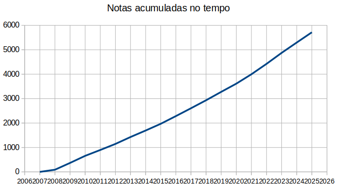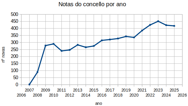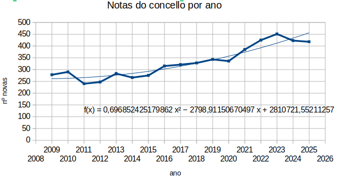 A gráfica anterior marca unha tendencia clara, pois aínda que os dous últimos anos tiveron unha cantidade de notas menor que o 2023, aínda seguen abondo por riba da media, e a liña de tendencia segue inclinándose: