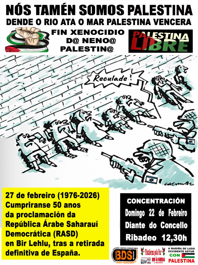 Un novo domingo haberá concentración pola paz en Ribadeo. Coa ameaza dunha nova ‘intervención’ dos EEUU, desta volta en Irán, para incrementar a guerra no mundo (dame medo dicir a ‘guerra mundial’ na que estamos inmersos). Despois de que nesta semana os EEUU atacaran e mataran a máis persoas no pacífico (presuntos narcotraficantes, din…) ou que a UE enviara a un representante á ‘Xunta de Paz para Gaza’ de Trump. Queda o cartel da convocatoria e fotos de Suso das dúas convocatorias pasadas, e o audio da convocatoria do día 8.