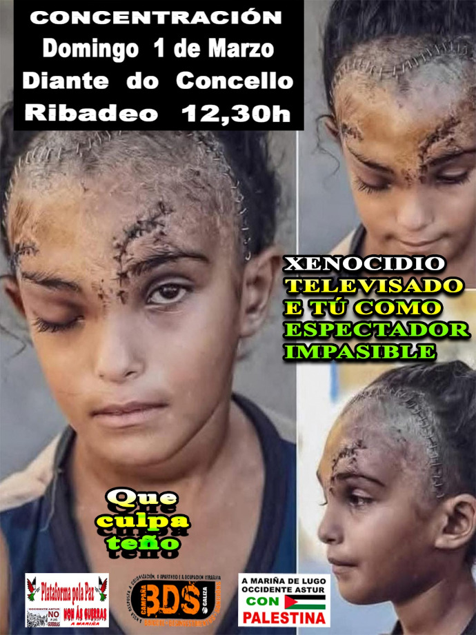 1 de marzo, domingo, Ribadeo. Paz. Concentración. Alí poderás saber máis da campaña BDS (Boicot, desinvestimento, sancións) e moitas cousas mais encamiñadas a lograr a paz, sexa en Palestina, Ucraína, Sudán, Sahara…